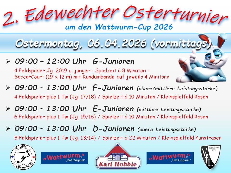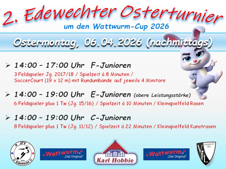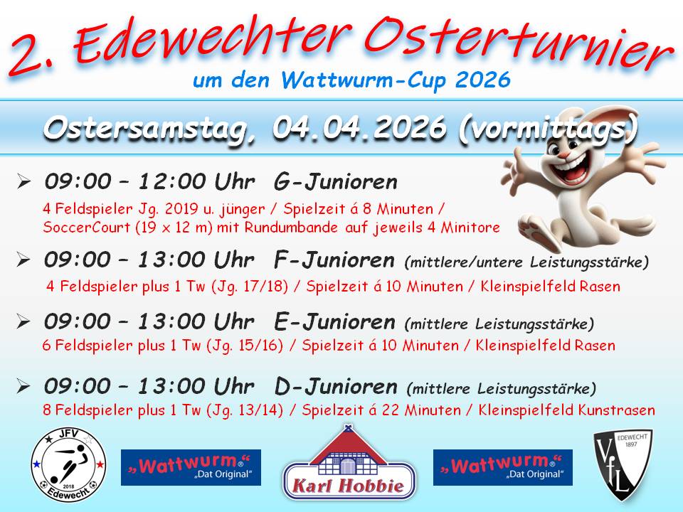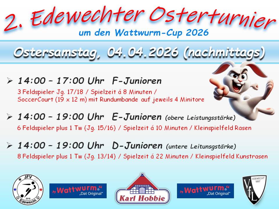 Nach erfolgreichem Auftakt im letzten Jahr, laden JFV Edewecht und VfL Edewecht dieses Jahr zu Ostern zum „2. Edewechter Osterturnier“ in den Edewechter Sportpark Göhlenweg, bei dem in diesem Jahr alle Plätze sowie der brandneu errichtete SoccerCourt zur Verfügung stehen, Teams der Altersklassen G-/F-/E-/D- und C-Junioren zum sportlichen Wettkampf um den „Watturm-Cup 2026“ ein.